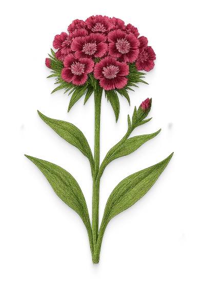 The Dianthus Barbatus, also known as Sweet William, embodies classic countryside beauty. Its robust stems support dense clusters of small flowers, with delicately serrated petals and a palette ranging from pure whites to pinks, reds, purples, and bicolour patterns.